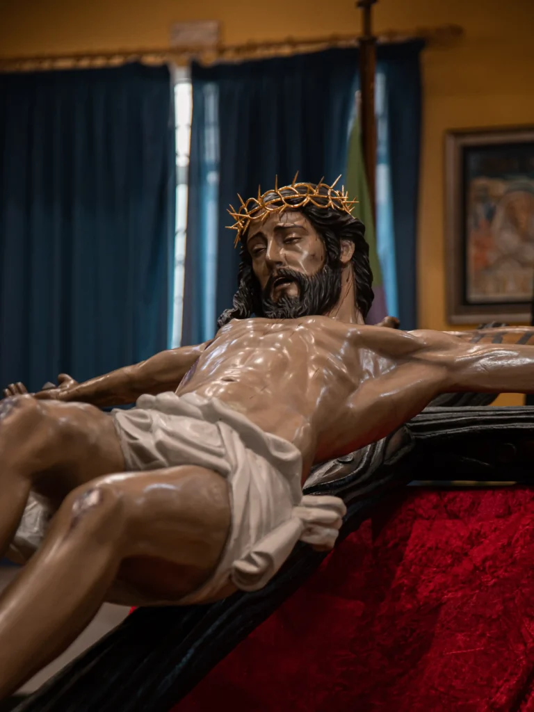 La actual talla data del año 1996 cuya autoría corresponde al imaginero malagueño D.Salvador Reina Segovia. La imagen de nuestro Titular Cristífero fue restaurada posteriormente por el imaginero D. José Dueñas Rosales. La talla representa a Jesús con las manos y los pies clavados en la Cruz y con la cabeza y el cuerpo en la postura en la que se describe justo en el momento posterior a su muerte. Previa a esta talla, procesionaba una atribuida a la escuela de imaginería de los Pirineos. Actualmente, se conserva en la capilla ubicada en nuestra Casa Hermandad en Calle Parra, teniendo sus salidas en Vía Crucis durante la madrugada del Jueves Santo al Viernes Santo. Actualmente el Santísimo Cristo de la Redención recorre las calles de Arroyo de la Miel, el Jueves Santo en Traslado y el Viernes Santo. La imagen puede ser visitada en la capilla de la Casa Hermandad donde se encuentra durante todo el año. Su color corporativo es el negro, siendo este el utilizado por capataces y nazarenos.