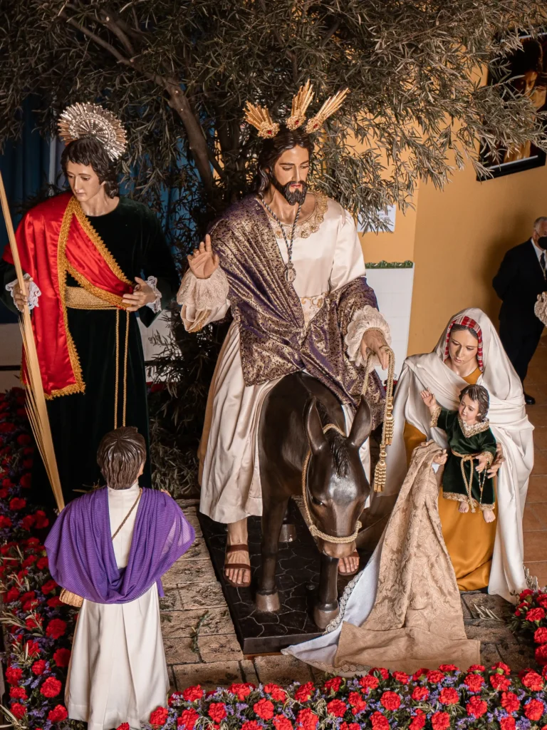 Esta talla que data del año 1996 es la primera en procesionar en el municipio de Benalmádena durante la Semana Santa. La talla que procesiona el Domingo de Ramos, conocida popularmente como Pollinica, es obra del imaginero José Dueña Rosales. En su iconografía representa a Jesús entrando en Jerusalén a lomos de un pollino, de ahí su nombre popular, sujetando con la mano izquierda las bridas de este y con su mano derecha bendice al pueblo, tal y como se representa en el evangelio. Detrás de la imagen econtramos un gran olivo que decora el trono con el fin de representar de la manera más real posible la escena que se narra en el evangelio. Alrededor de la imagen encontramos un grupo escultórico formado por, un San Juan, una Samaritana con un niño en brazos, y un niño. La imagen de Nuestro Padre Jesús a su entrada en Jerusalén se encuentra en la capilla ubicada en nuestra Casa Hermandad. Su color corporativo es el morado, utilizado por los hombres de trono.